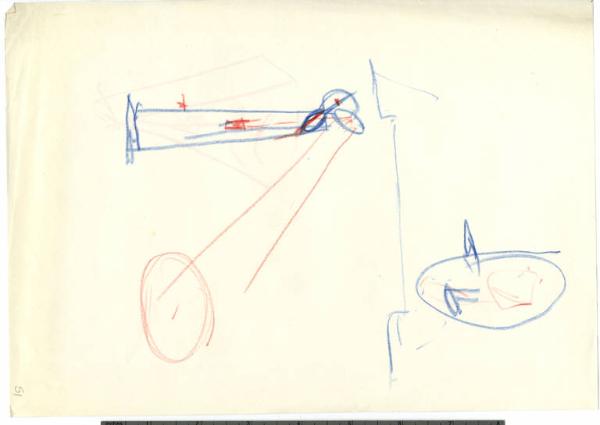 Schizzi in matita blu della lampada Gibigiana e schizzi in matita rossa per indicare la luce prodotta dalla lampada.