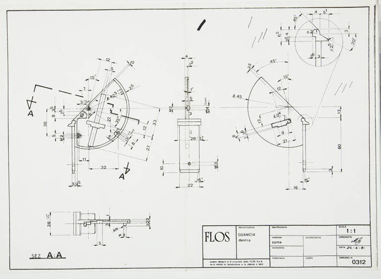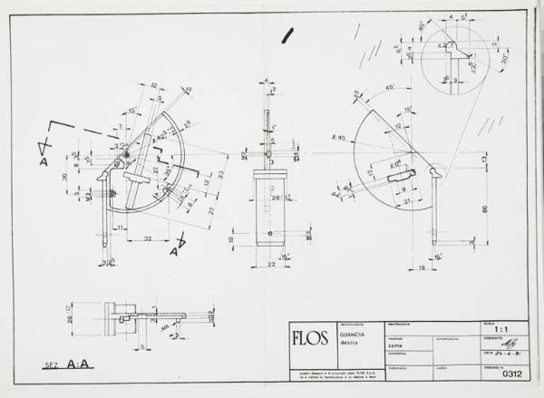 Tavola tecnica raffigurante sezioni della guancia destra della lampada Gibigiana