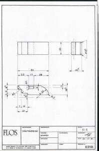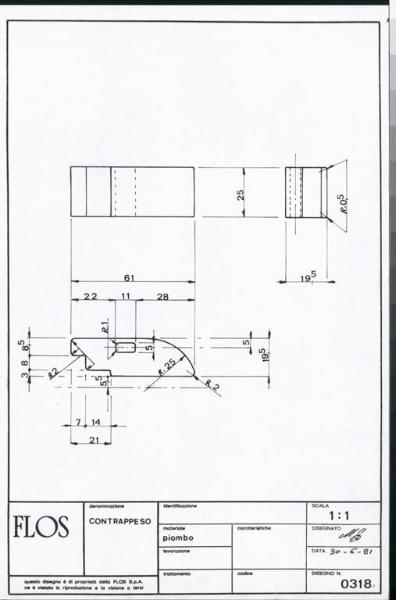 Tavola tecnica raffigurante pianta, prospetto e sezioni della vite di regolazione della lampada Gibigiana