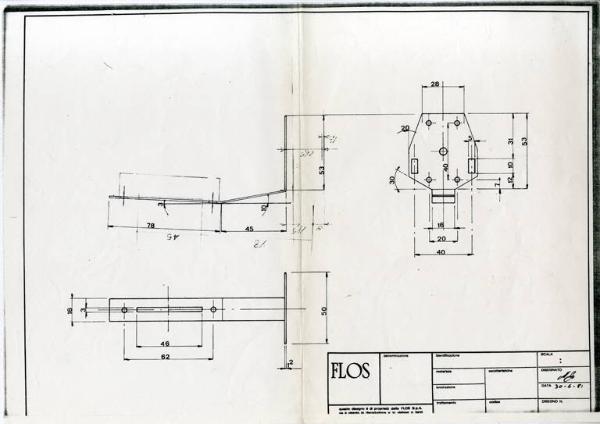 Tavola tecnica raffigurante pianta, prospetto e sezioni del raccordo di base della lampada Gibigiana