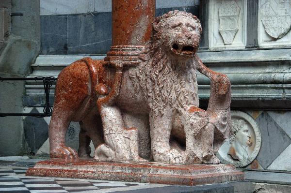 Leone stiloforo in marmo rosso di Verona scolpito: due figure di giovani in ginocchio aiutano il leone a reggere il peso della colonna.