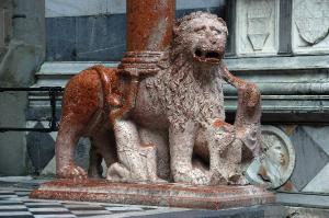 - NOTIZIE STORICO CRITICHE Il leone, come il compagno posto a sinistra, è stato eseguito tra il 1350 e il 1360 dalla bottega di Giovanni da Campione che, anche per questo particolare iconografico, segue alla lettera il modello dei protiri dell'antica tradizione romanica lombarda, spesso introdotti da figure simili di leone i funzione di avvertimento al visitatore e di simbolica difesa del luogo sacro.\nL'opera è stata restaurata tra il 1997 e il 1998 (si veda la relazione tecnica preliminare in data 30 luglio 1996, pratica 4816, cart. 75, Archivio della Congregazione della Misericordia Maggiore, Bergamo).