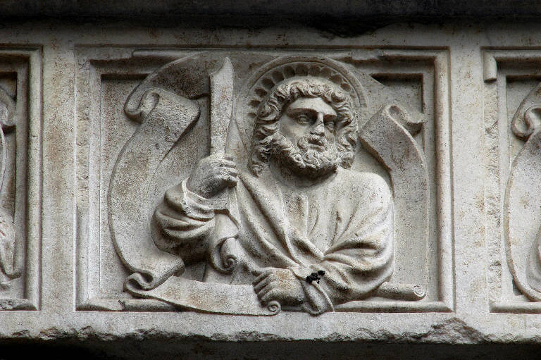 Rilievo in marmo bianco rosato di Candoglia scolpito: figura di apostolo racchiusa entro cornice quadrangolare.