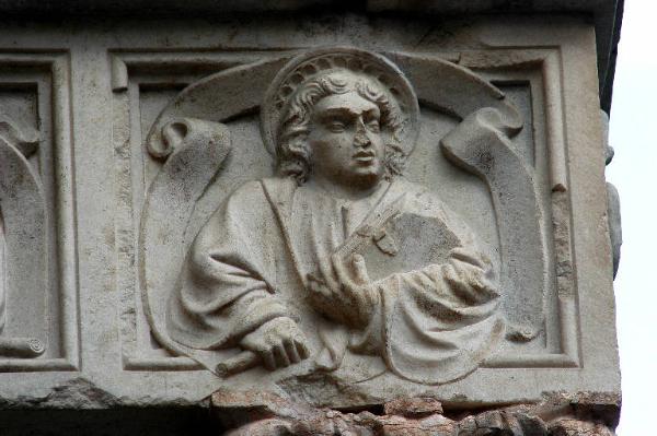 Rilievo in marmo bianco rosato di Candoglia scolpito: figura di apostolo racchiusa entro cornice quadrangolare.