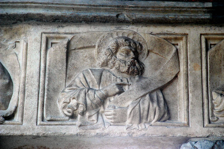 Rilievo in marmo bianco rosato di Candoglia scolpito: figura di apostolo racchiusa entro cornice quadrangolare.