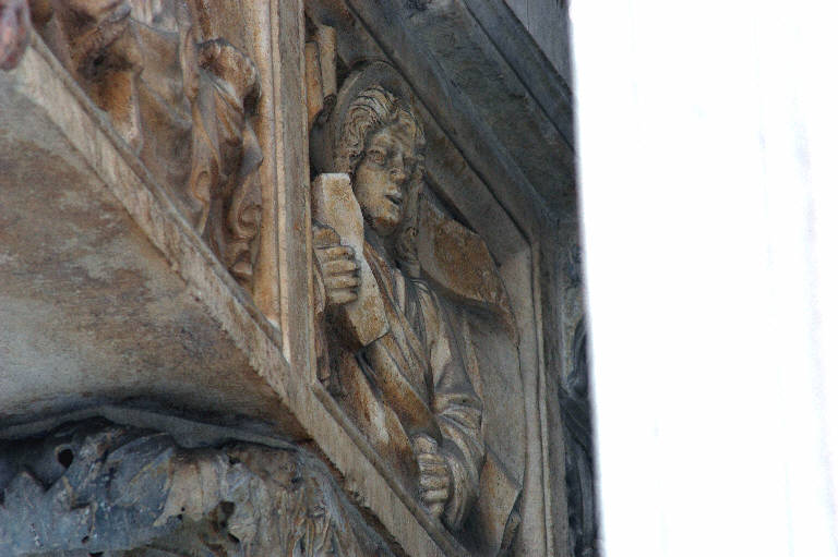 Rilievo in marmo bianco rosato di Candoglia scolpito: figura di apostolo racchiusa entro cornice quadrangolare.