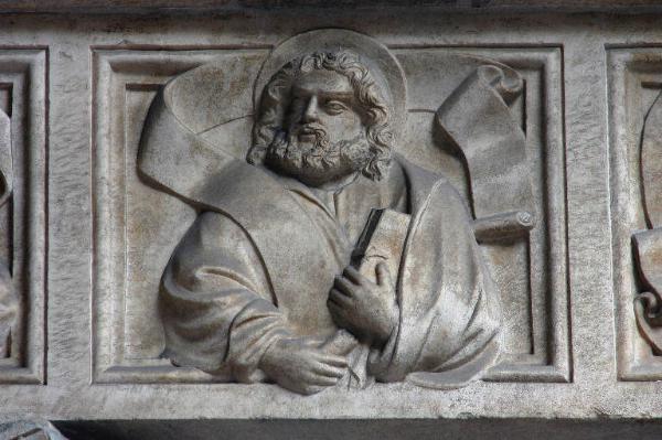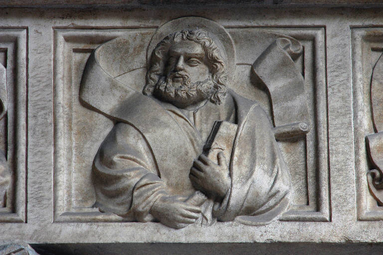 Rilievo in marmo bianco rosato di Candoglia scolpito: figura di apostolo racchiusa entro cornice quadrangolare.
