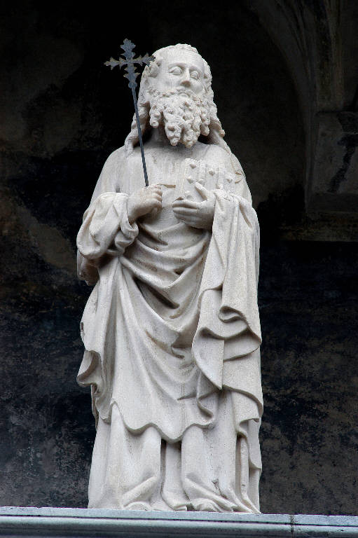 - NOTIZIE STORICO CRITICHE La statua è stata eseguita da Giovani da Campione, o da un suo stretto collaboratore, al tempo dei lavori per il protiro del transetto setterionale, tra il 1350 e il 1360. Baroni, nel 1944, nella rapida rassegna critica che dedicò a questa e alle altre statue delle due logge, sottolineava una evoluzione di stile, rispetto alla solenne, severa imponenza del "Sant'Alessandro a cavallo": evidente, soprattutto, a detta dello studioso, nella "più sciolta naturalezza", nella "pungente profilatura che vince l'originaria tumescenza di volumi compatti, costruiti a grandi blocchi", nell'"ombra che scava la forma di taglio, profondamente"; resta identico, invece, e perfettamante riconoscibile, il tono aristocratico e sostenuto del linguaggio (Baroni, p. 49).\nL'opera è stata restaurata tra il 1997 e il 1998 (si veda la relazione tecnica preliminare in data 30 luglio 1996, pratica 4816, cart. 75, Archivio della Congregazione della Misericordia Maggiore, Bergamo).