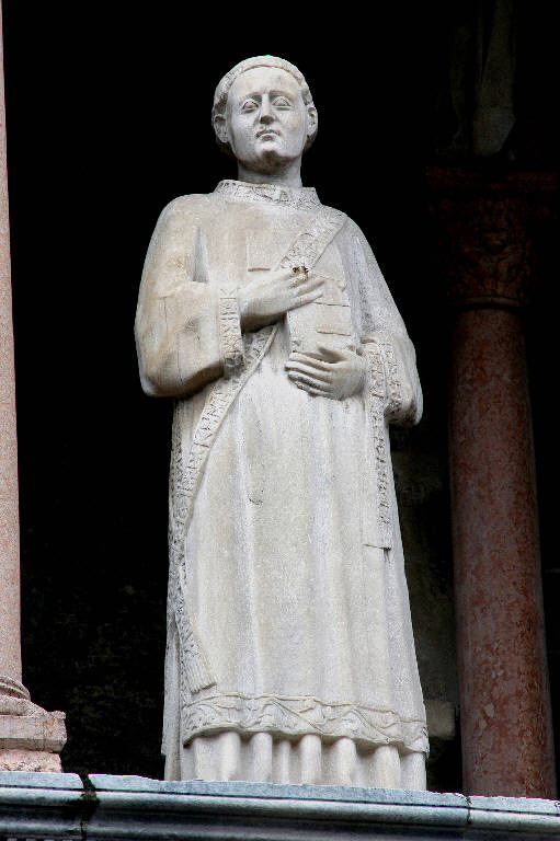 - NOTIZIE STORICO CRITICHE La statua non è ancora stata identificata con certezza: per lungo tempo si è pensato che raffigurasse San Proiettizio, diacono di Bergamo e martire; ora è stata avanzata l'ipotesi che possa trattarsi di San Vincenzo, diacono di Saragozza (Zanchi, 2003); ma in assenza di attributi riconducibili con precisione all'uno o all'altro santo, la questione resta aperta. \nBaroni, nella rapida rassegna che dedicò nel 1944, alle statue delle logge del protiro di Santa Maria Maggiore, giudicò questa ieratica figura di santo la "restituzione tardogotica di altro esemplare pertinente al ciclo" (p. 48); e in effetti, l'opera mostra un linguaggio assai diverso, e modi più secchi e rigidi, rispetto alle altre sculture che ornano il monumentale ingresso della basilica.\nL'opera è stata restaurata tra il 1997 e il 1998 (si veda la relazione tecnica preliminare in data 30 luglio 1996, pratica 4816, cart. 75, Archivio della Congregazione della Misericordia Maggiore, Bergamo).
