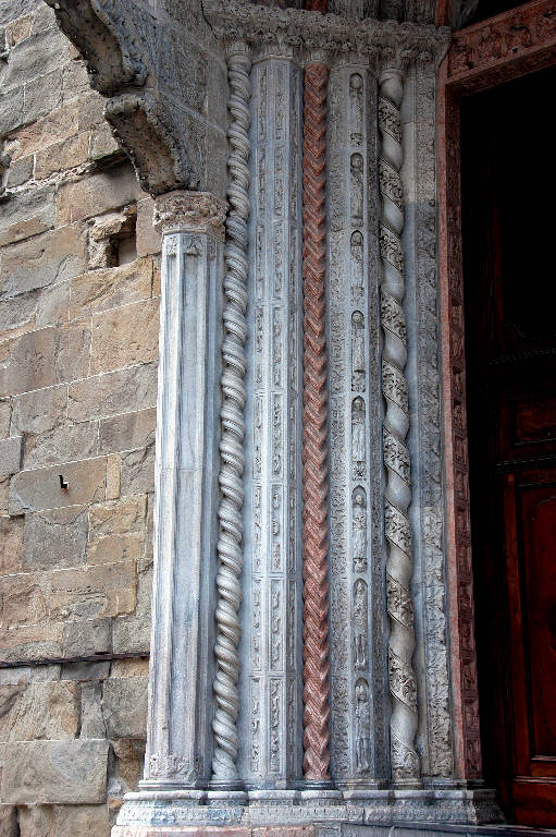Semipilastro del portale in marmo bianco di Musso, scolpito a formelle rettangolari allungate che racchiudono figure di animali e di pastori.