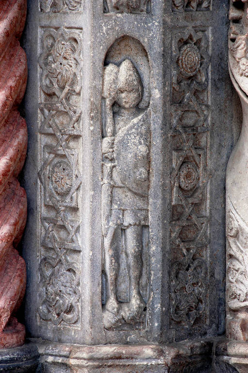 Formella in marmo bianco di Musso scolpito: racchiude entro nicchia archiacuta una figura di soldato.