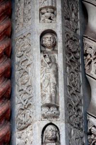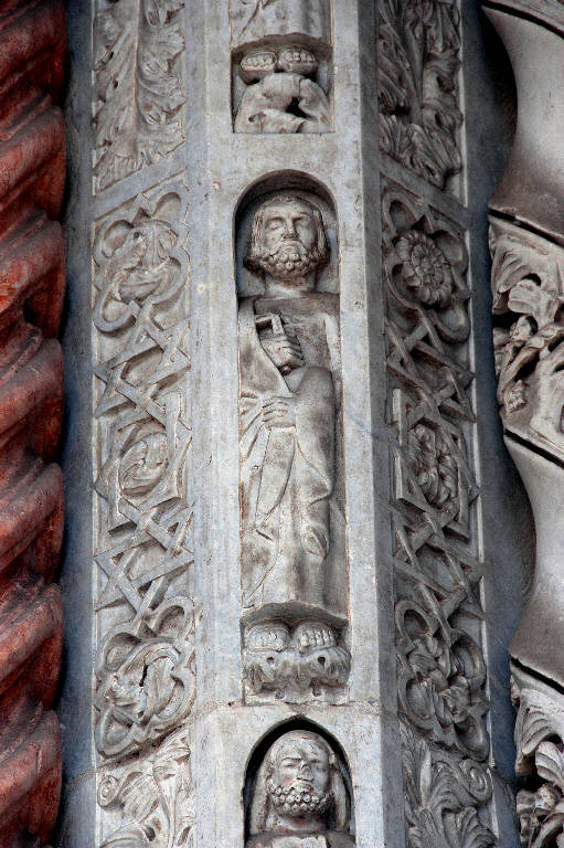 Formella in marmo bianco di Musso scolpito: racchiude entro nicchia archiacuta una figura di apostolo.