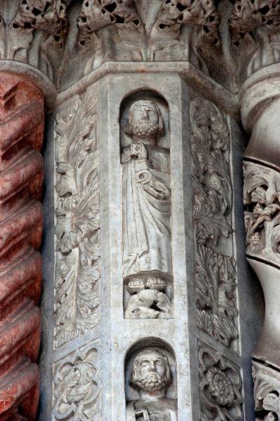 Formella in marmo bianco di Musso scolpito: racchiude entro nicchia archiacuta una figura di apostolo.