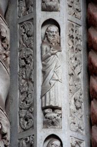 Formella in marmo bianco di Musso scolpito: racchiude entro nicchia archiacuta una figura di apostolo.