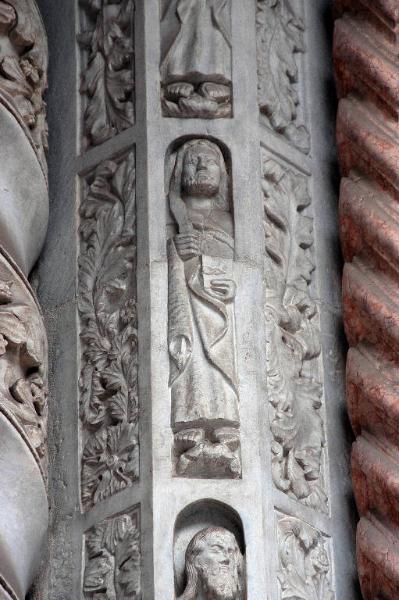 Formella in marmo bianco di Musso scolpito: racchiude entro nicchia archiacuta una figura di apostolo.