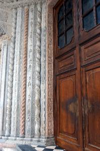 Stipite sinistro del portale in marmo rosso di Verona scolpito a formelle che racchiudono entro cornici quadrangolari teste di profilo, aquile e motivi di grandi foglie.