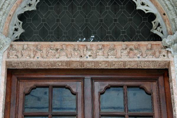 Architrave del portale in marmo rosso di Verona scolpito: al centro, figura di Cristo; alla sua destra e alla sua sinistra, i dodici Apostoli.