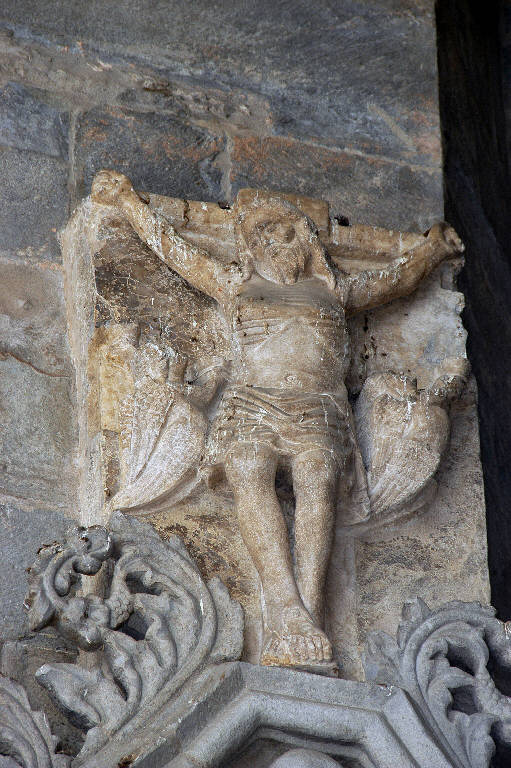 - NOTIZIE STORICO CRITICHE La bella lastra con Cristo crocifisso accompagnato da due angeli dolenti è stata realizzata da Giovanni da Campione, o da un suo stretto collaboratore, tra il 1364 e il 1367 (Lomartire, 2009, pp. 75-77).\nL'opera è stata sottoposta a restauro conservativo nel 2001(consolidamento e pulitura; progetto e direzione architetto Giuseppe Napoleone, Soprintendenza ai Beni Architettonici di Milano; lavori eseguiti dalla ditta Lares, Venezia; cfr. Buonincontri, 2005, p. 214); un precedente intervento è documentato tra il 1978 e il 1981, sotto la direzione dell'architetto Sandro Angelini (Buonincontri, cit.).