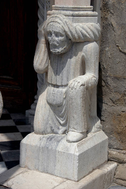 Telamone in marmo bianco di Candoglia scolpito; regge la colonna di fondo del protiro, a destra.