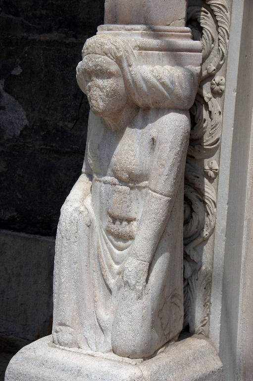 Telamone in marmo bianco scolpito; regge la colonna di fondo del protiro, a sinistra.