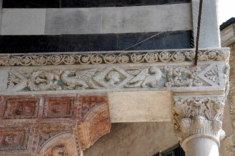 - NOTIZIE STORICO CRITICHE Il fregio del fianco dell'architrave, come l'intera struttura del protiro, è stato realizzato dalla bottega di Giovanni da Campione tra il 1350 e il 1360 circa.\nL'opera è stata restaurata tra il 1999 e il 2000 (Buonincontri, 2005, p. 248).