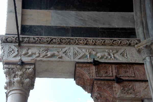 Rilievo del lato esterno dell'architrave a sinistra, scolpito in marmo bianco e ornato da un fregio a girali con foglie, fiori, e boccioli di fiore, da foglie d'acanto entro formelle triangolari, da figure di animali fantastici e da piccoli alberi da frutta.