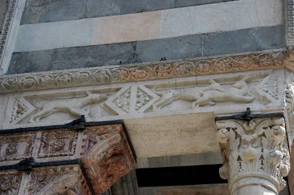Rilievo del lato interno dell'architrave a sinistra, scolpito in marmo bianco e ornato da figure di levrieri che inseguono un cervo, da foglie e boccioli di fiore entro formelle triangolari e da un fregio a girali con foglie e fiori.