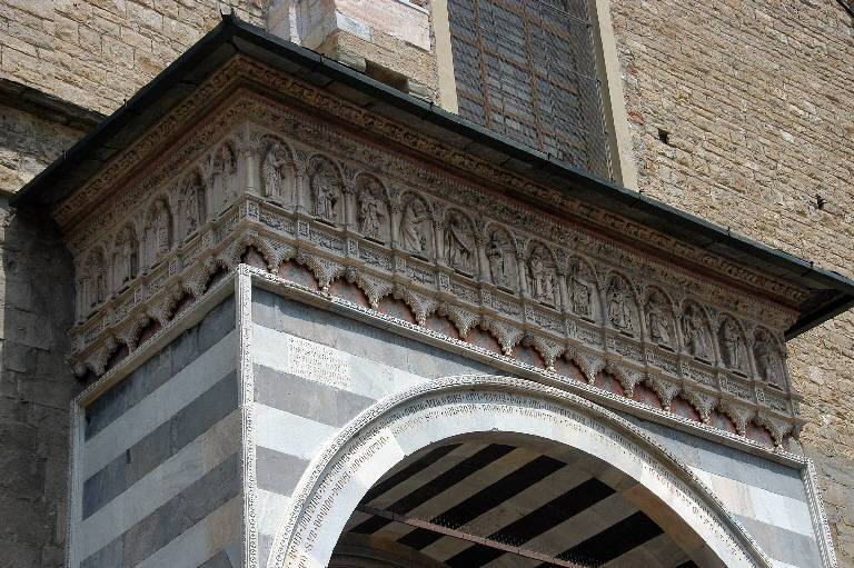 - NOTIZIE STORICO CRITICHE Le sculture del ricco fregio posto sull'attico, eseguito ad evidenza in anni assai più tardi rispetto al protiro e probabilmente non previsto nel disegno originale, sono state riferite da Costantino Baroni ad Andreolo de' Bianchi, orafo e scultore noto per la elegante croce prcessionale ornata di formelle a sbalzo eseguita nel 1392 per il tesoro della Basilica, e rubata diversi anni fa; ma l'assenza di opere certe di riferimento, nel catalogo dell'artista, non consente di confermare l'ipotesi avanzata da Baroni; restano validi, di quella proposta, la datazione, attorno alla fine del XIV secolo, e l'ambito culturale in cui si muove l'anonimo autore del fregio, che è certamente lombardo, per la grazia cesellata dei sontuosi ornati collocati con minuta cura su tutta la superficie del rilievo (C. Baroni "La scultura gotica lombarda", Milano 1944, p. 130; Lomartire, 2009, p. 74).\nL'opera è stata restaurata tra il 1999 e il 2000 (Buonincontri, 2005, p. 248).