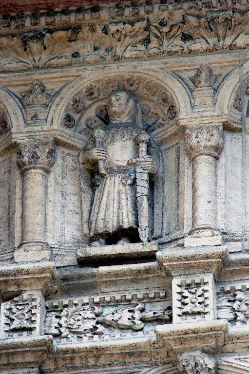 - NOTIZIE STORICO CRITICHE Il rilievo, come tutte le sculture del fregio posto sull'attico, è stato riferito da Costantino Baroni ad Andreolo de' Bianchi, orafo e scultore noto per la elegante croce prcessionale ornata di formelle a sbalzo eseguita nel 1392 per il tesoro della Basilica, e rubata diversi anni fa; ma l'assenza di opere certe di riferimento, nel catalogo dell'artista, non consente di confermare l'ipotesi avanzata da Baroni; restano validi, di quella proposta, la datazione, attorno alla fine del XIV secolo, e l'ambito culturale in cui si muove l'anonimo autore del fregio, che è certamente lombardo, per la grazia cesellata dei sontuosi ornati collocati con minuta cura su tutta la superficie del rilievo (C. Baroni "La scultura gotica lombarda", Milano 1944, p. 130; Lomartire, 2009, p. 74).\nL'opera è stata restaurata tra il 1999 e il 2000 (Buonincontri, 2005, p. 248).