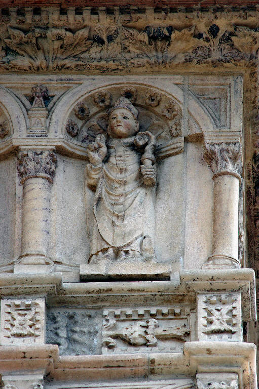 - NOTIZIE STORICO CRITICHE Il rilievo, come tutte le sculture del fregio posto sull'attico, è stato riferito da Costantino Baroni ad Andreolo de' Bianchi, orafo e scultore noto per la elegante croce prcessionale ornata di formelle a sbalzo eseguita nel 1392 per il tesoro della Basilica, e rubata diversi anni fa; ma l'assenza di opere certe di riferimento, nel catalogo dell'artista, non consente di confermare l'ipotesi avanzata da Baroni; restano validi, di quella proposta, la datazione, attorno alla fine del XIV secolo, e l'ambito culturale in cui si muove l'anonimo autore del fregio, che è certamente lombardo, per la grazia cesellata dei sontuosi ornati collocati con minuta cura su tutta la superficie del rilievo (C. Baroni "La scultura gotica lombarda", Milano 1944, p. 130; Lomartire, 2009, p. 74).\nL'opera è stata restaurata tra il 1999 e il 2000 (Buonincontri, 2005, p. 248).