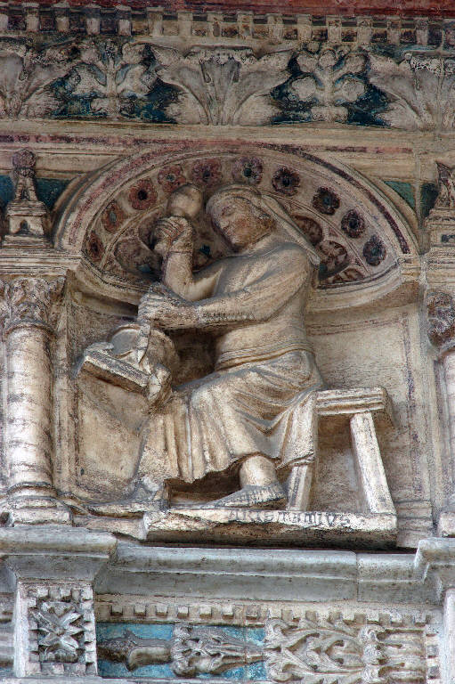 - NOTIZIE STORICO CRITICHE Il rilievo raffigura uno dei "Quattro Santi Coronati", protettori dei lapicidi; come tutte le sculture del fregio posto sull'attico, è stato riferito da Costantino Baroni ad Andreolo de' Bianchi, orafo e scultore noto per la elegante croce prcessionale ornata di formelle a sbalzo eseguita nel 1392 per il tesoro della Basilica, e rubata diversi anni fa; ma l'assenza di opere certe di riferimento, nel catalogo dell'artista, non consente di confermare l'ipotesi avanzata da Baroni; restano validi, di quella proposta, la datazione, attorno alla fine del XIV secolo, e l'ambito culturale in cui si muove l'anonimo autore del fregio, che è certamente lombardo, per la grazia cesellata dei sontuosi ornati collocati con minuta cura su tutta la superficie del rilievo (C. Baroni "La scultura gotica lombarda", Milano 1944, p. 130; Lomartire, 2009, p. 74).\nL'opera è stata restaurata tra il 1999 e il 2000 (Buonincontri, 2005, p. 248).