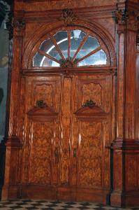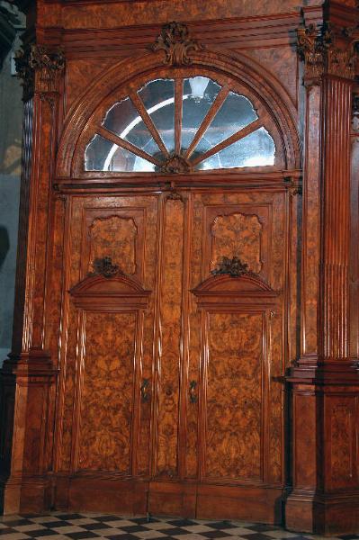 Porta centrale a due battenti in legno di noce intagliato e modanato e impiallacciatura in radica di noce (lato interno); è sormontata da una lunetta vetrata a raggi.