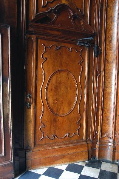 Portina laterale a un battente in legno di noce intagliato e modanato e impiallacciatura in radica di noce (lato interno).