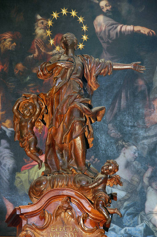 - NOTIZIE STORICO CRITICHE Il gruppo scultoreo, che raffigura la "Madonna Immacolata" attorniata da angeli, è tradizionalmente attribuito allo scultore d'origine austriaca Giovanni Antonio Sanz, come le altre due statue che ornano il coronamento della bussola (Pinetti, 1931, p. 87; Zanchi, 2003, p. 387).\nL'opera è stata restaurata nel 1998 (cfr. "Relazione tecnica del restauro delle bussole poste sul lato nord della Basilica di Santa Maria Maggiore in Bergamo", 6 luglio 1998, prot. 2593, cat. 5, class. 6, fasc. 17, Archivio Congregazione Misericordia Maggiore, Bergamo).