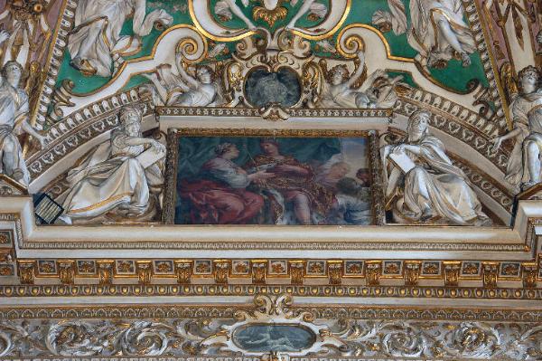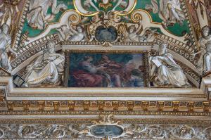 Decorazione della lunetta che racchiude l'affresco di Ciro Ferri con l'episodio di "Ester e Assuero": a destra e a sinistra, due grandi figure di profeti che reggono pegamene; al centro, cartiglio in stucco a volute, retto da due angioletti.