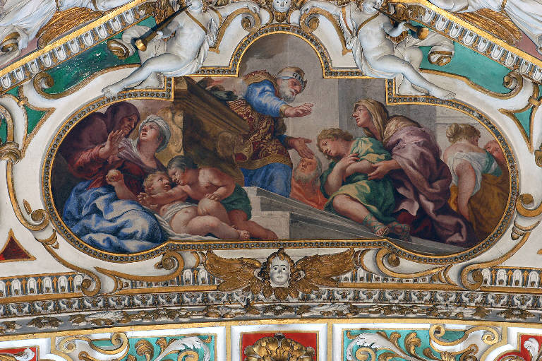 - NOTIZIE STORICO CRITICHE L'affresco, che racconta la cerimonia di consacrazione del piccolo Samuele, futuro pofeta, nel tempio di Silo (Libro dei Re, I,26), fu dipinto da Ciro Ferri tra il 1666 e il 1667, come gli altri che ornano la volta della prima campata (Noris, in "I pittori bergamaschi...Il Seicento", vol. IV, pp. 122-127; p. 166, scheda 10). \nL'opera è stata restaurata nel 1960 da Franco Steffanoni (cfr. "Relazione sui lavori di restauro eseguiti ai dipinti della Basilica di Santa Maria Maggiore per incarico dell'E.C.A. di Bergamo", 24 maggio 1961, protoc. 1232, cat. 5, clas. 6, fasc. 17, Archivio Congregazione Misericordia Maggiore, Bergamo).