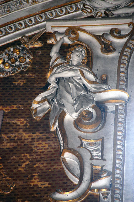 Figura di angelo in funzione di telamone, con il braccio destro alzato e il sinistro piegato attorno al busto.