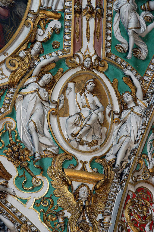 Virtù entro cornice ovale sorretta da una coppia di angeliin volo.