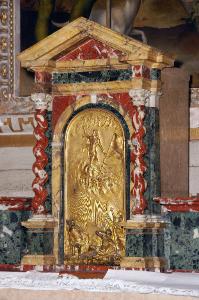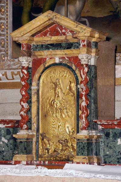 Tabernacolo a tempietto in marmo verde, sorretto da colonnine tortili in marmo rosso, con timpano e cornice della portina in marmo giallo crema; sportello di tabernacolo in metallo dorato e sbalzato, con immagine della "Resurrezione di Cristo".