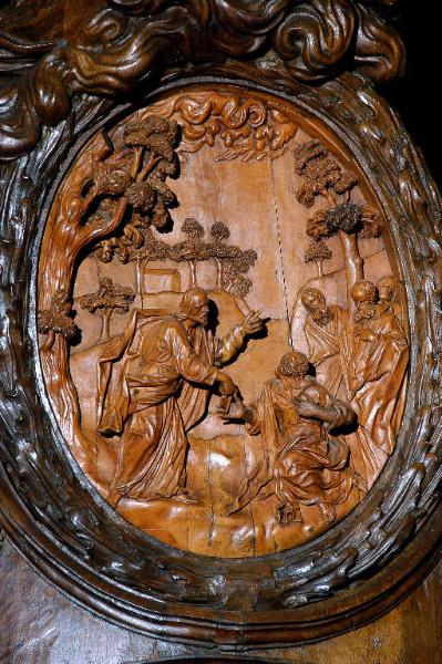 - NOTIZIE STORICO CRITICHE Il rilievo appartiene al confessionale scolpito da Andrea Fantoni tra il 1704 e il 1705 per il Duomo di Bergamo, su commissione del canonico Giovan Pietro Mazza.\nL'opera ha subito un delicato intervento di restauro nel 1999, a cura di Eugenio e Luciano Gritti del Consorzio Professionale Restauratori d'Arte (l'intervento è descritto in dettaglio in Curatola/ Gritti/ Zanchi, 2000, pp.44-53).