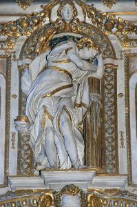 - NOTIZIE STORICO CRITICHE La vicenda della decorazione della Basilica di Santa Maria Maggiore è assai bene documentata dai pagamenti conservati nei libri contabili della Congregazione della Misericordia Maggiore, che permettono di seguire quasi ad annum le fasi del cantiere (Rampinelli, 2001; Spirirti, 2009): agli stucchi della navata centrale lavorarono, tra il 1675 e il 1679, Giovanni Angelo Sala e il figlio Gerolamo, artisti ticinesi d'origine, impegnati negli stessi anni in numerosi altri cantieri bergamaschi; valga per tutti l'impresa delle meravigliose sagrestie della Basilica di San Martino ad Alzano Lombardo (cfr. M. Olivari in "Le sagrestie di Alzano Lombardo nella Basilica di San Martino", Cinisello Balsamo 1994, pp. 19-22). Le grandi figure di angeli che ornano gli spazi sopra gli archi non sono esplicitamente citate nei documenti della Basilica, ma è assai probabile che siano state anch'esse eseguite nelle stesse date.
