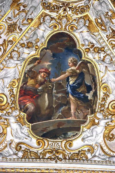 - NOTIZIE STORICO CRITICHE Il dipinto illustra l'episodio narrato nel libro dei Numeri (22): l'asina del mago Balaam vide apparire un angelo con la spada sguainata e, parlando con la voce del Signore, proibisce al padrone di andare a maledire il popolo di Israele. La tela fu eseguita da Nicolò Malinconico tra il 1693 e il 1694, come tutte le altre che ornano la volta della seconda campata della navata centrale (Noris, in "I pittori bergamschi...Il Seicento", vol. IV, pp. 167-168, scheda 12).\nL'opera è stata restaurata nel 1959 da Franco Steffanoni (cfr. relazione in data 9 settembre 1959, protoc. 1735, cat. MM, clas. IV, fasc. 5/c, Archivio Congregazione Misericordia Maggiore, Bergamo).