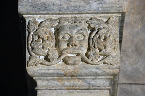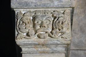 Rilievo scolpito con testa mostruosa circondata da racemi e foglie.