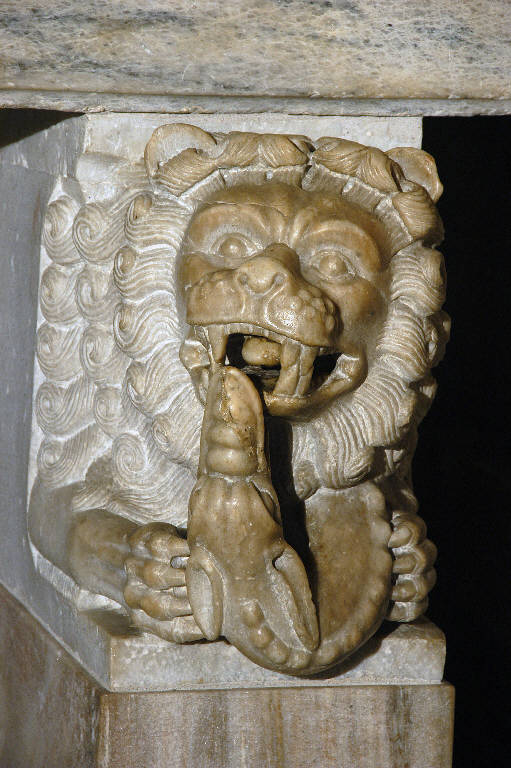 - NOTIZIE STORICO CRITICHE Il leone, come l'intero monumento funebre del cardinal Longhi, è attribuito ad Ugo da Campione, che l'avrebbe eseguito poco dopo la morte del prelato, avvenuta ad Avignone nel 1319 (Baroni, 1944, pp. 36-38: Lomartire, 2009, pp. 57-60). La scultura è stata rimaneggiata nel XIX secolo, al tempo della ricostruzione del monumento: è certamente di fattura moderna, infatti, l'alto plinto su cui poggia.\nL'opera ha subito nel 2000 un intervento di pulitura (pratica 324, cart. 82, Archivio Congregazione Misericordia Maggiore, Bergamo).