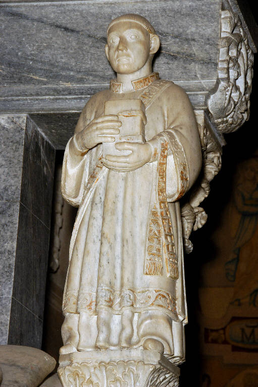 - NOTIZIE STORICO CRITICHE La statua, come l'intero monumento funebre del cardinal Longhi, è attribuita ad Ugo da Campione, che l'avrebbe eseguita poco dopo la morte del prelato, avvenuta ad Avignone nel 1319 (Baroni, 1944, pp. 36-38: Lomartire, 2009, pp. 57-60). \nL'opera ha subito nel 2000 un intervento di pulitura (pratica 324, cart. 82, Archivio Congregazione Misericordia Maggiore, Bergamo).
