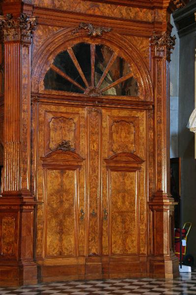 - NOTIZIE STORICO CRITICHE La porta centrale, come l'intero complesso della bussola d'ingresso al transetto destro, fu realizzata dall'intagliatore bergamasco Giuseppe Alari verso il 1770 (Pinetti, 1931, p. 87; Zanchi, 2003, p. 387); è stata restaurata nel 1998 (cfr. relazione tecnica in data 13 maggio 1998, prot. 1821, cat. 5, clas. 6, fasc. 17, Archivio Congregazione Misericordia Maggiore, Bergamo).