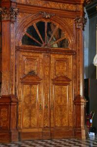 Porta centrale a due battenti in legno di noce intagliato e modanato e impiallacciatura in radica di noce (lato interno); è sormontata da una lunetta vetrata a raggi.
