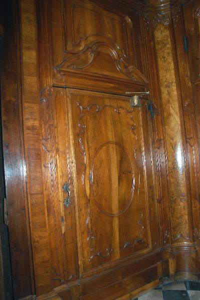 Portina laterale a un battente in legno di noce intagliato e modanato e impiallacciatura in radica di noce (lato interno).