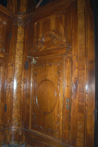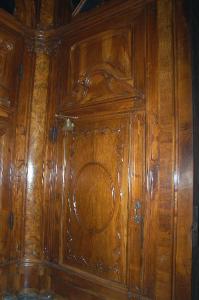 Portina laterale a un battente in legno di noce intagliato e modanato e impiallacciatura in radica di noce (lato interno).