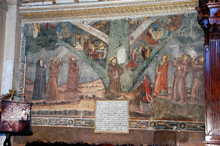 - NOTIZIE STORICO CRITICHE L'affresco, che Pellegrino Tibaldi volle fosse risparmiato, per la sua "antichità e belezza", dalla radicale riforma che, nel corso del tardo XVI secolo, cambiò profondamente il volto della Basilica di Santa Maria Maggiore, fu poi in gran parte coperto nel 1661 dal grande telero con il "Diluvio Universale" di Pietro Liberi e dalla ricca cornice in stucco che lo racchiude. \nL'iscrizione posta in basso al centro, che è stata probabilmente ridipinta nel XVII secolo, riprendendo, con qualche errore di trascrizione qua e là, l'antico testo trecentesco, documenta le circostanze della commissione e dell'esecuzione del grande affresco con l'"Albero della Vita": Guidino de' Suardi, nobile bergamasco celebre per la sua devozione, l'avrebbe fatto dipngere nel 1347, chiedendo al pittore di seguire minuziosamente il testo che al "Lignum Vitae" aveva dedicato padre Bonaventura da Bagnoregio nel 1260.I n effetti, l'iconografia è strettamente aderente al testo del frate francescano, che aveva ideato quell'immagine per meglio imprimere nella memoria dei fedeli i fatti principali della vita di Cristo: un grande albero, con la figura di Cristo crocifisso al centro e dodici rami, sei per lato, da cui pendono per ciascuno quattro tondi con scene della vita del Salvatore; sopra ogni tondo, il ramo reca un cartiglio con una iscrizione tratta dal testo di San Bonaventura.\nIl grande affresco, che la recente letteratura critica riferisce ad un anonimo artista di raffinata cultura ricca di elementi lombardi ed emiliani, convenzionalmente chiamato, appunto, "Maestro dell'Albero della Vita" (Pellati, in "I pittori bergamaschi...Le origini", pp. 187-211), è stato verosimilmente dipinto in una data assai vicina a quella testimoniata dall'iscrizione, e cioè attorno al 1347; l'altra data del 1342, che talvolta le fonti riferiscono, potrebbe forse alludere all'anno in cui all'opera si diede inizio (Pellati, cit.). In ogni caso, l'"Albero della Vita" era certamente compiuto nel 1364, quando venne menzionato per la prima volta nei libri contabili della Basilica (Matalon, 1963, pp. 366-367).\nL'immagine del committente ricordato dall'iscrizione, Guidino de' Suardi, compare nell'affresco in basso al centro, vicino alle radici del grande albero: la figura èstata certamente dipinta a secco su uno strato di intonaco successivo alla prima stesura, forse pochi decenni dopo la conclusione del dipinto (Angelini, 1953, pp. 12-17); per questo motivo siè talvota dubitato dell'esattezza dell'annotazione contenuta in quel testo. Di Guidino, comunque, sia stato oppure no il committente dell'affresco, non sappiamo molto: figlio di Tetualdo Suardi, abitava nel palazzo posto all'angolo nord occidentale della piazza su cui s'affacciano il Duomo e Santa Maria Maggiore; il suo nome compare in un atto del 1349, e nel 1353 risulta già morto (Zanchi, 2003, pp. 89-120).